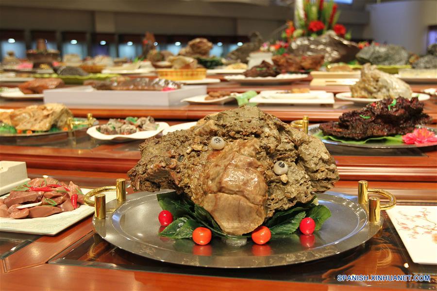 HAMI, junio 14, 2016 (Xinhua) --Piedras con forma de platillos son expuestas en bandejas, en el museo de piedras raras local, en Hami, en la Región Autónoma Uygur de Xinjiang, en el noroeste de China, el 14 de junio de 2016. En total, 1,088 "platillos" hechos de pidras raras, como madera silicificada, ágata y piedra de sandre, fueron exhibidos en el museo el martes. (Xinhua/Polat)