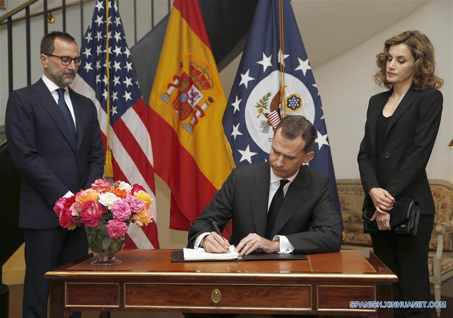 Los reyes de Espa?a Don Felipe VI (c) y Do?a Letizia (d), asisten a firmar el libro de condolencias en la embajada de Estados Unidos de América en Madrid en tributo a las víctimas del tiroteo de Orlando, en presencia del embajador de Estados Unidos de América en Espa?a, James Costos (i), en Madrid, capital de Espa?a, el 14 de junio de 2016. Al menos 50 personas murieron y otras 53 resultaron heridas, incluido un oficial de la policía, en el ataque de la madrugada del domingo en un centro nocturno gay, en Orlando, Florida, Estados Unidos de América. (Xinhua/face to face/ZUMAPRESS)