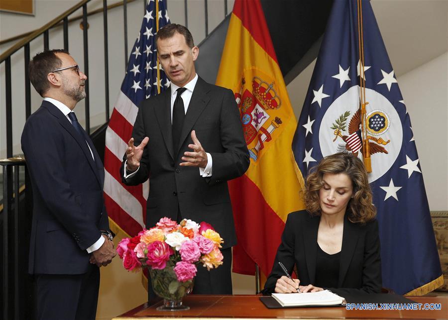 Los reyes de Espa?a Don Felipe VI (c) y Do?a Letizia (d), asisten a firmar el libro de condolencias en la embajada de Estados Unidos de América en Madrid en tributo a las víctimas del tiroteo de Orlando, en presencia del embajador de Estados Unidos de América en Espa?a, James Costos (i), en Madrid, capital de Espa?a, el 14 de junio de 2016. Al menos 50 personas murieron y otras 53 resultaron heridas, incluido un oficial de la policía, en el ataque de la madrugada del domingo en un centro nocturno gay, en Orlando, Florida, Estados Unidos de América. (Xinhua/face to face/ZUMAPRESS)