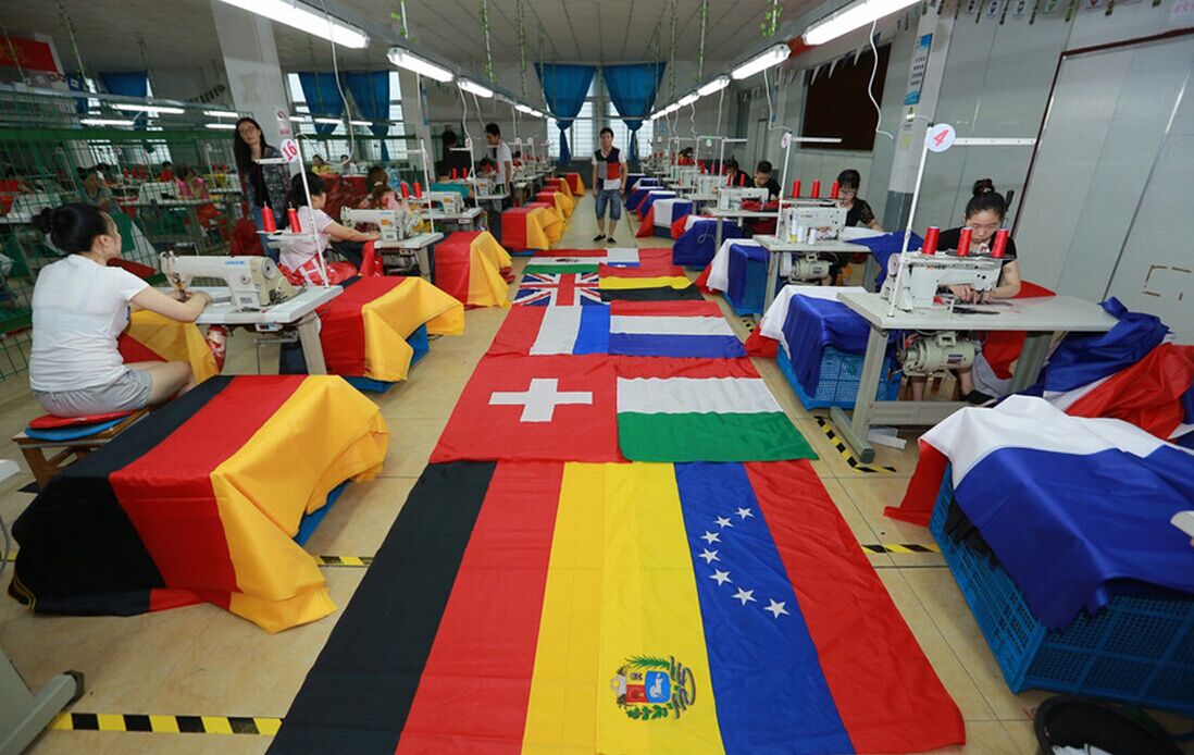 Manufactura de banderas nacionales en la empresa Shaoxing de la provincia de Zhejiang.