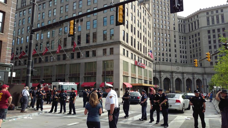 CLEVELAND, junio 22, 2016 (Xinhua) -- Imagen tomada con un teléfono móvil de oficiales de policía montando guardia cerca del sitio de un tiroteo en Cleveland, Estados Unidos de América, el 22 de junio de 2016. Una mujer resultó herida de bala el miércoles después del desfile de la victoria de los Cavaliers de Cleveland, informó el Departamento de Policía de Cleveland. (Xinhua/Wu Lei)