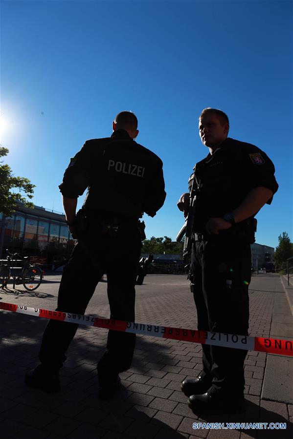Dos policías alemanes vigilan el cine donde un hombre armado hizo disparos, en Viernheim, Alemania, el 23 de junio de 2016. Al menos 25 personas resultaron heridas el jueves en un ataque con gas lacrimógeno lanzado en un cine de una ciudad del suroeste de Alemania. Un hombre armado entró en el cine en la ciudad de Viernheim, hizo disparos al aire y lanzó un ataque con gas lacrimógeno, lo que causó las heridas, informó la televisión local. El atacante murió y aún se desconoce qué lo motivó a llevar a cabo la agresión. (Xinhua/Luo Huanhuan)