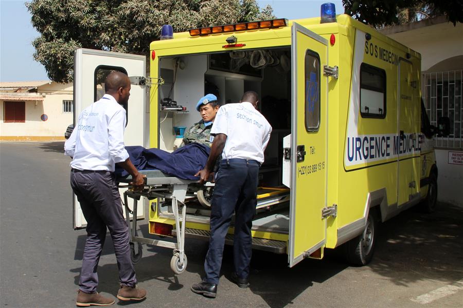 Li Tao (al centro), soldado chino de la Fuerza de Paz de la ONU, sale de un hospital en Dakar, Senegal, el 26 de junio del 2016. Los cuatro cascos azules chinos que fueron heridos en Mali durante un ataque terrorista partieron hacia la patria. (Foto: Wang Meng)