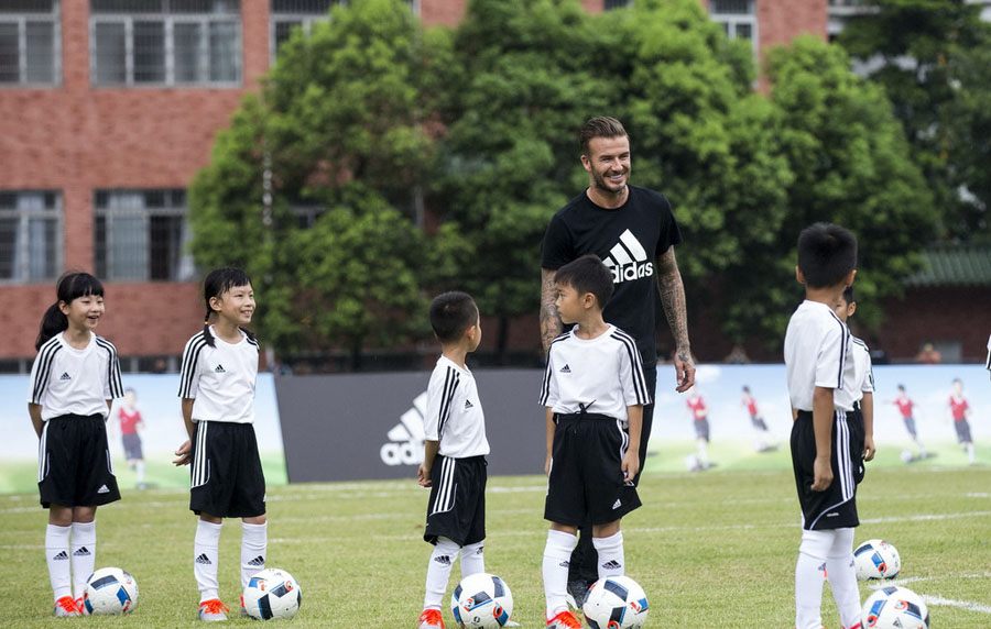 Guangzhou,30/06/2016 (El Pueblo en Línea) -El astro inglés del fútbol David Beckham ense?a a ni?os chinos a jugar al fútbol durante una campa?a de Adidas en la escuela de secundaria Zhixin de Guangzhou, provincia de Guangdong, el 28 de junio de 2016. Su aparición causó un gran revuelo en el campus y en internet en China. Beckham jugó al fútbol con los estudiantes y expresó su esperanza en poder trasmitir su pasión por el fútbol en estos estudiantes.