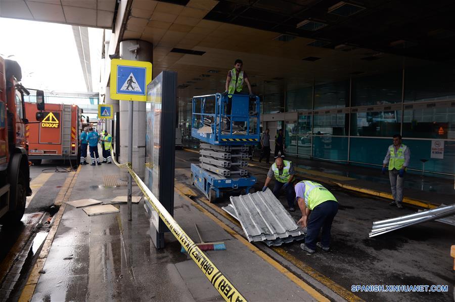 Trabajadores inspeccionan los da?os a la entrada del Aeropuerto Internacional Ataturk, en Estambul, Turquía, el 29 de junio de 2016. Turquía anunció el miércoles un día de luto nacional por las 41 vidas perdidas anoche durante los letales ataques con bomba perpetrados en el Aeropuerto Ataturk de Estambul, uno de los más transitados en Europa. En todo el país se izaron las banderas a media asta por los muertos, entre los cuales hay 12 extranjeros de Arabia Saudí, Irak, Túnez, Irán, Ucrania, Jordania y Uzbekistán. (Xinhua/Depo Photos/ZUMAPRESS)