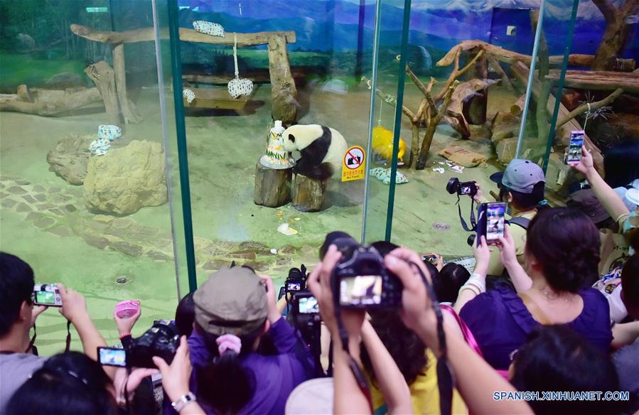 Personas toman fotografías del panda gigante "Yuanzai" que toma su tarta de cumplea?os en el Zoológico de Taipei, en Taipei, Taiwan,en el sureste de China, el 2 de julio de 2016. El zoológico realizó una fiesta de cumplea?os para Yuanzai que está a punto de cumplir 3 a?os de edad. (Xinhua/Wei Peiquan)