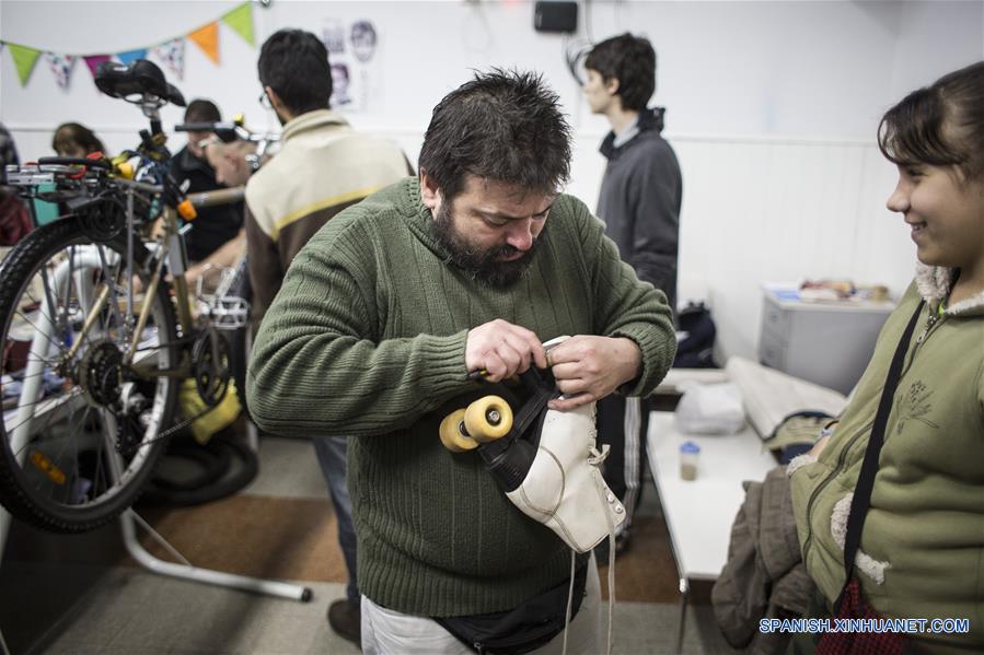 Una persona intenta reparar un patín durante el evento "Club de Reparadores", en Buenos Aires, capital de Argentina, el 2 de julio de 2016. Amigos, desconocidos o simples curiosos, expertos y amateurs se reunieron el sábado en Buenos Aires, pese a la lluvia, para una nueva edición del "Club de reparadores", iniciativa que impulsa la reparación de objetos. Melina Scioli, una de las organizadoras, explicó que el Club es un evento itinerante de reparación colectiva, "un encuentro que propiciamos para reunir a reparadores profesionales, reparadores amateurs y a gente que tiene la voluntad de aprender a reparar objetos". Se busca "extenderles la vida útil y evitar que se terminen convirtiendo en residuos", enfatizó. (Xinhua/Martín Zabala)