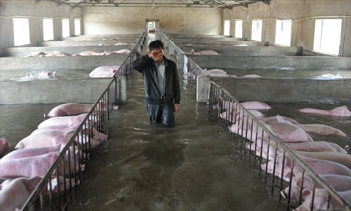 Anhui,05/07/2016 (El Pueblo en Línea) - En la foto se ve que el propietario de una granja de cerdos de la provincia de Anhui en el centro de China está llorando por la suerte de sus 6.000 cerdos, los cuales han estado en el agua que llega a sus cuellos durante casi 20 horas debido a las fuertes inundaciones. Parece que es imposible que los mueva a un lugar seguro.