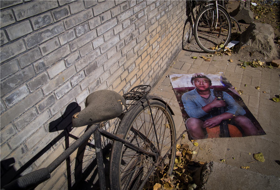 Bicicleta aparcada en un hutong de Beijing, junto a un cartel de un músico en el suelo.