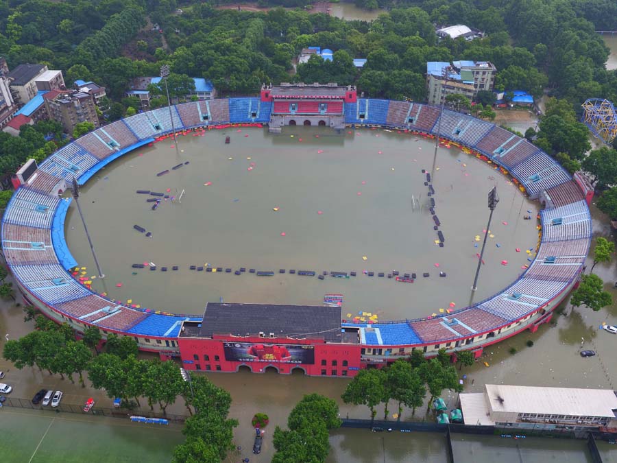Estadio transformado en una "piscina gigante" debido a las inundaciones en Wuhan, el 6 de julio de 2016. [Foto por Hu Jiusi/Asianewsphoto]