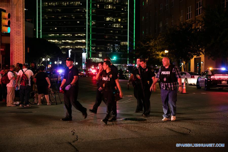 Policías patrullan después de un tiroteo en Dallas, estado de Texas, Estados Unidos de América, el 7 de julio de 2016. Cinco policías murieron y otros seis resultaron heridos el jueves por la noche tras ser alcanzados por dos francotiradores que abrieron fuego durante una manifestación contra los tiroteos protagonizados por agentes de la policía en todo Estados Unidos. (Xinhua/Tian Dan)