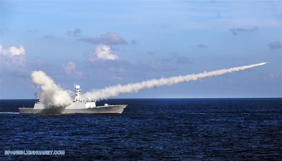 MAR MERIDIONAL DE CHINA, julio 8, 2016 (Xinhua) -- La fragata de misiles Yuncheng lanza un misil antibuques durante un ejercicio militar llevado a cabo en la zona de aguas cerca de la isla de Hainan y las islas de Xisha de China, el 8 de julio de 2016. La Marina china realizó este viernes un ejercicio de combate anual en la zona de aguas cerca de la isla de Hainan y las islas de Xisha de China. (Xinhua/Zha Chunming)