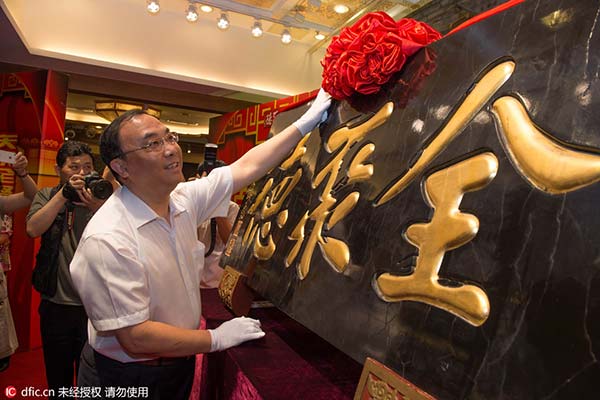 Xing Ying, director general del grupo Quanjude, devela una inscripción durante la ceremonia que conmemora los 150 a?os de la fundación del restaurante Quanjude en Qianmen, Beijing, 2 de julio de 2014. [Foto: IC]