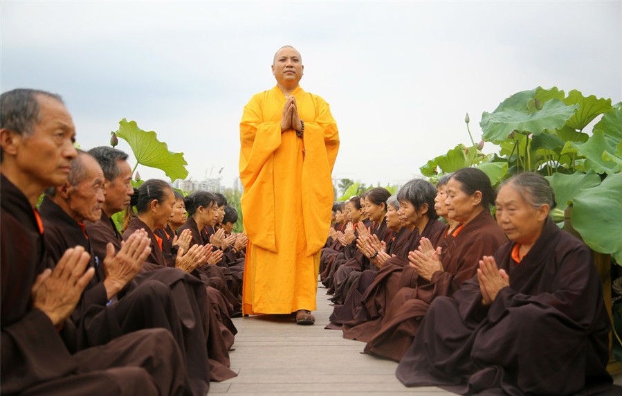 Cerca de 100 monjes budistas del Templo Guangde se reúnen en Suining, provincia de Sichuan, para meditar y practicar Zen en un gran estanque de lotos el 12 de julio.