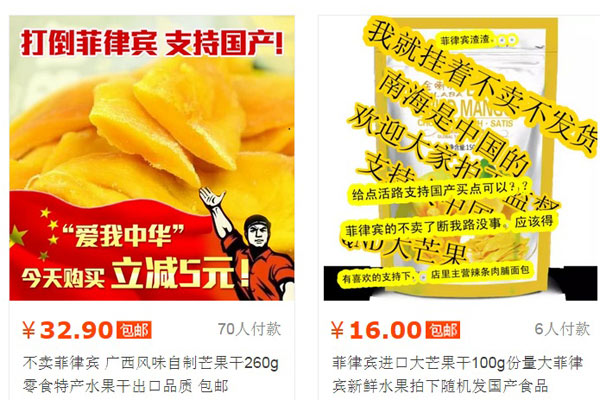 En la búsqueda de este producto en la plataforma, en lugar de imágenes mango seco importado de Filipinas, muchos vendedores han puesto un mapa de China se?alando el Mar Meridional de China con las palabras "Nunca volveré a vender este producto. Soy un peque?o vendedor y también chino".