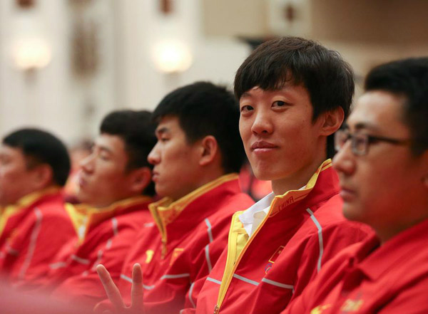 El campeón de salto Zhang Guowei (segundo derecha) asiste a la ceremonia. [Foto/Xinhua]