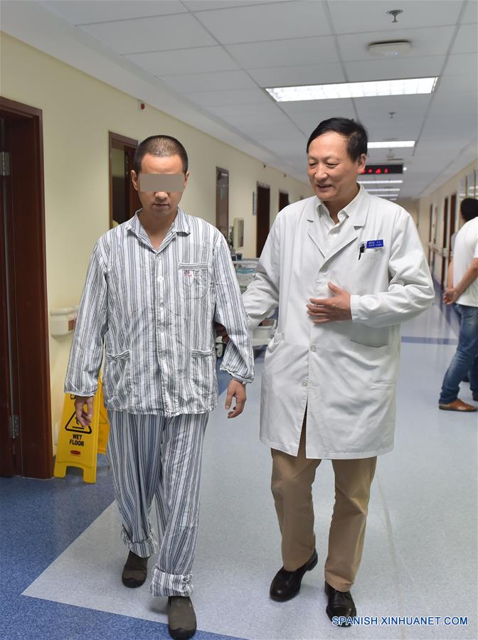 BEIJING, julio 19, 2016 (Xinhua) -- Liu Zhongjun (d), cirujano del Tercer Hospital de la Universidad de Pekín, camina con su paciente en Beijing, capital de China, el 19 de julio de 2016. Médicos chinos lograron un récord en una operación de columna vertebral al sustituir cinco vértebras con una réplica impresa en 3D.