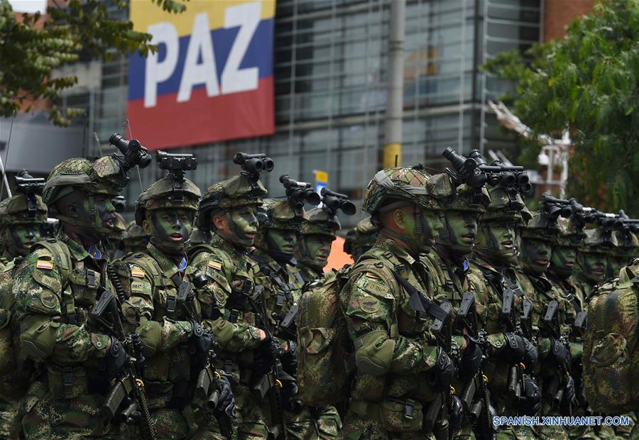 Imagen cedida por el Ministerio de Defensa (Mindefensa) de Colombia de militares participando en el desfile militar con el lema "La Paz es la Victoria" como parte de la conmemoración del 206 aniversario de la Independencia de Colombia, en Bogotá, capital de Colombia, el 20 de julio de 2016. De acuerdo con información de la prensa local, miembros del Ejército, la Armada, la Fuerza Aérea y la Policía Militar participaron en un desfile militar al que asistieron cientos de residentes en Bogotá. (Xinhua/Javier Casella/Mindefensa)