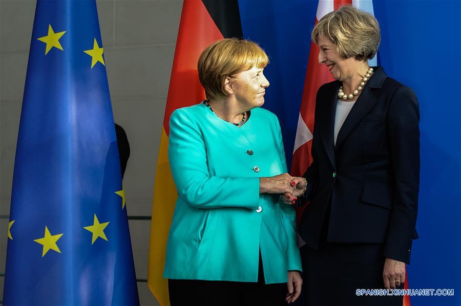 La canciller alemana, Angela Merkel (i), y la primera ministra de Reino Unido, Theresa May (d), participan en una conferencia de prensa después de su reunión en la Cancillería en Berlín, Alemania, el 20 de julio de 2016. De acuerdo con información de la prensa local, Reino Unido mantendrá relaciones económicas cercanas con Alemania a pesar de su intención de abandonar la Unión Europea (UE), dijo el miércoles la primera ministra Theresa May durante su visita a Alemania. (Xinhua/Guo Yang)