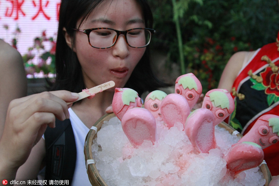 Una mujer come helados con forma de pimiento durante un reto celebrado en Hangzhou, provincia de Zhejiang, el 20 de julio de 2016. [Foto/IC]