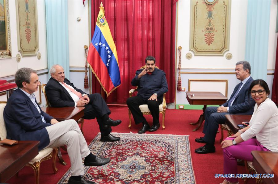 CARACAS, julio 21, 2016 (Xinhua) -- Imagen cedida por la Presidencia de Venezuela, del presidente venezolano, Nicolás Maduro (c), participando en una reunión con el secretario general de la Unión de Naciones Suramericanas (Unasur), Ernesto Samper (2-i), el expresidente del Gobierno de Espa?a, José Luis Rodríguez Zapatero (i), el expresidente de República Dominicana, Leonel Fernández (2-d), y con la canciller venezolana, Delcy Rodríguez (d), en el Palacio de Miraflores, en Caracas, Venezuela, el 21 de julio de 2016. Nicolás Maduro se reunió el jueves en el Palacio de Miraflores con el secretario general de la Unasur, Ernesto Samper, y la comisión de mediadres conformada por el ex jefe del gobierno espa?ol, José Luis Rodríguez Zapatero, y por los expresidentes Martín Torrijos de Panamá y Leonel Fernández de República Dominicana. La actividad se lleva a cabo para continuar conversaciones sobre el proceso de diálogo entre el gobierno y la oposición en Venezuela. (Xinhua/Presidencia de Venezuela)