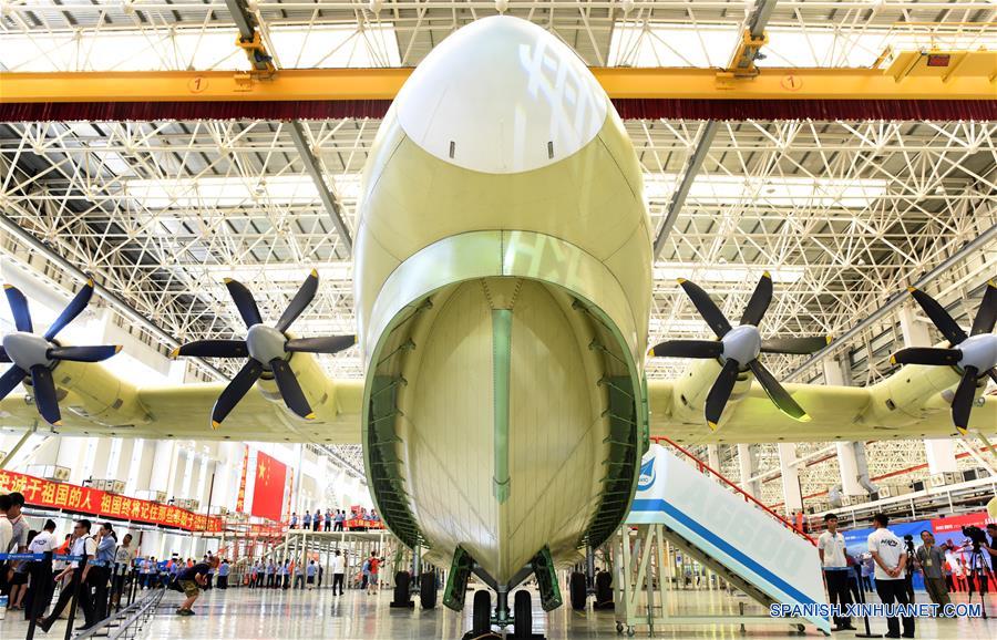 La aeronave anfibia AG600 sale de la línea de producción en Zhuhai, en la provincia de Guangdong, en el sur de China, el 23 de julio de 2016.La aeronave que tiene un peso máximo de despegue de 53.5 toneladas y un rango de vuelo máximo de 4,500 km, será utilizado para combatir incendios forestales y realizar misiones de rescate marino. El AG600 es por mucho la aeronave anfibia más grande del mundo, cerca del tama?o de un BOeing 737. (Xinhua/Liang Xu)