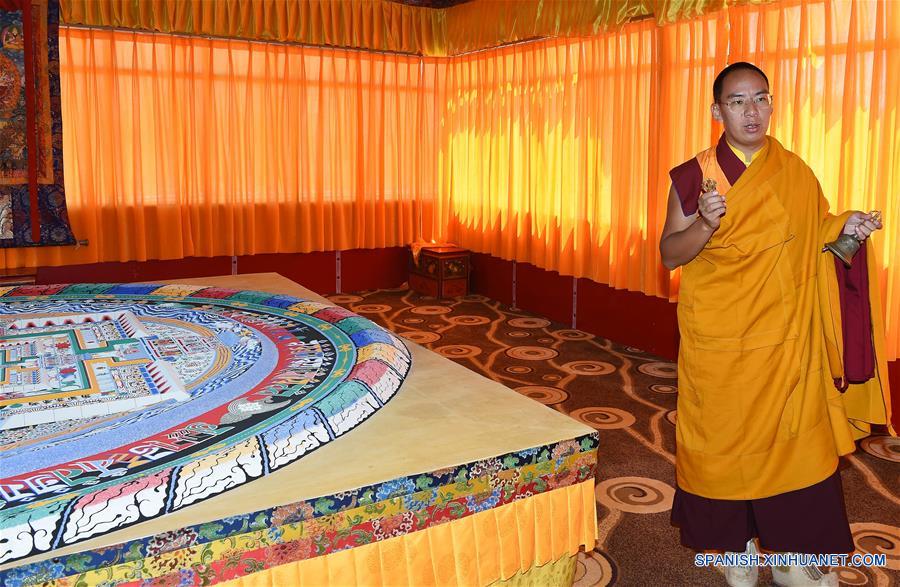 Imagen del 25 de julio de 2016 del XI Panchen Lama, Bainqen Erdini Qoigyijabu, observando junto a una mándala elaborada de arena coloreada, en Xigaze, en la región autónoma del Tíbet, en el suroeste de China. El primer ritual de Kalachakra (rueda del tiempo) realizado por el XI Panchen Lama, Bainqen Erdini Qoigyijabu, concluyó el lunes. El Kalachakra de cuatro días fue realizado en el Nuevo Palacio del Panchen Lama a petición de los monjes del monasterio lamaísta Zhaxi Lhunbo, templo de origen de los Panchen Lama, en Xigaze. (Xinhua/Chogo)