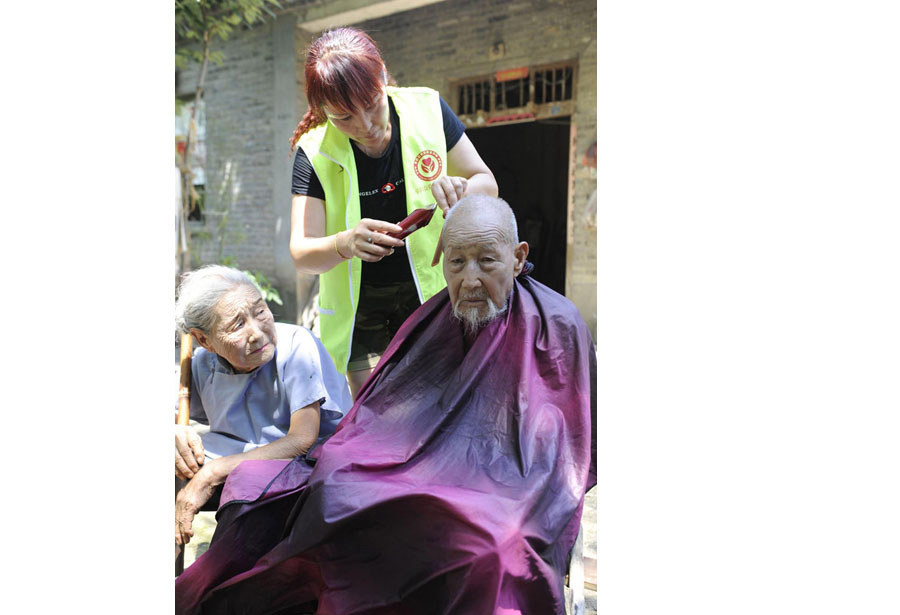 Una voluntaria corta el pelo a Song Qinglin, de 102 a?os, antes de la sesión de fotos para celebrar sus 80 a?os de matrimonio en la aldea Songzhai de Sangying, en el condado Taihe de Fuyang, provincia de Anhui, el 23 de julio de 2016.
