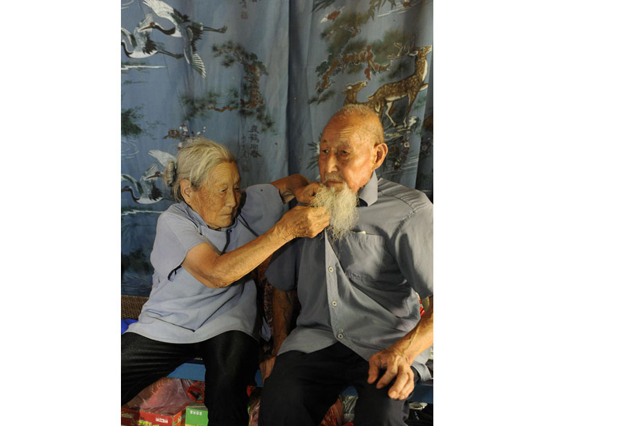 Song Lishi, de 99 a?os, ayuda a su marido Song Qinglin, de 102 a?os, a abrocharse un botón antes de tomarse las fotos que conmemoran sus 80 a?os de matrimonio en la aldea Songzhai de Sangying, en el condado Taihe de Fuyang, provincia de Anhui, el 23 de julio de 2016.