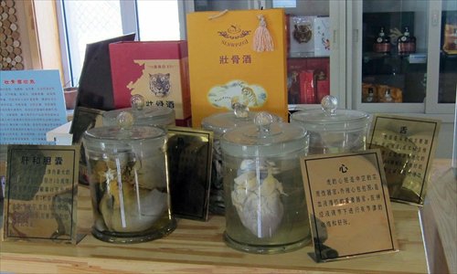 Los órganos de tigre (no para la venta) y el vino de hueso de tigre (en venta) se muestran en la tienda de regalos del recinto del tigre siberiano de Harbin, provincia de Heilongjiang. (Foto: IC)
