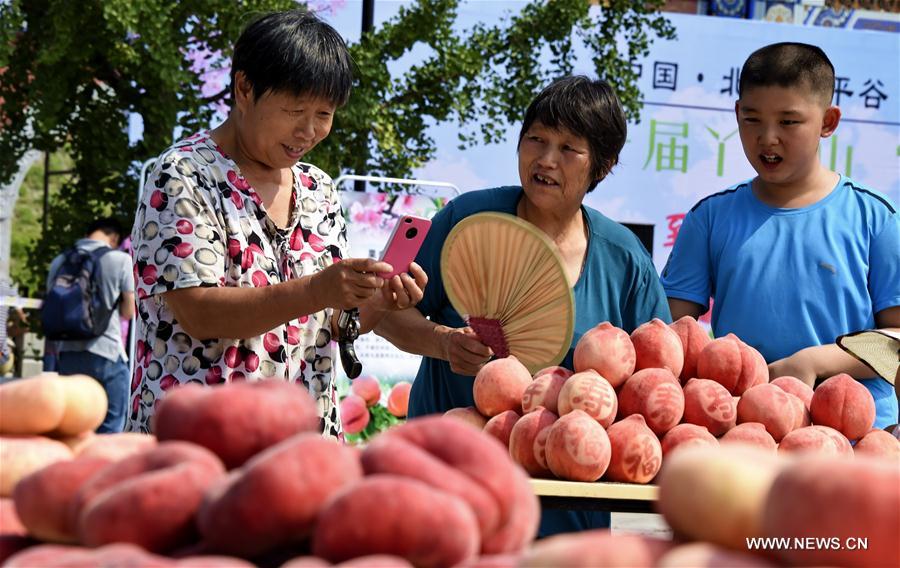 Los residentes locales visitan el Festival del Melocotón en Liujiadian, distrito Pinggu de Beijing, el 28 de julio de 2016. Más de 100 variedades de melocotones fueron exhibidas en el evento del jueves. El área de cultivo de melocotones en Liujiadian ha superado las 1.200 hectáreas, con una producción de 35.000 toneladas. (Xinhua/Li Xin)