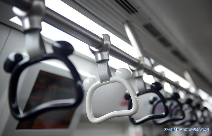 Vista del interior de un vagón decorado con temática de pandas en la línea 3 del metro en Chengdu, en la provincia de Sichuan, en el suroeste de China, el 31 de julio de 2016. La primera fase del proyecto de la Línea 3 del metro de Chengdu comenzó su operación de prueba el domingo. Un tren decorado con temática de pandas fue puesto en uso en la línea. (Xinhua/Xue Yubin)
