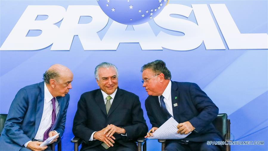 Imagen cedida por la Presidencia de Brasil, del presidente interino brasile?o Michel Temer (c), y el ministro de Relaciones Exteriores de Brasil, José Serra (i) y de Agricultura, Ganadería y Abastecimiento, Bairro Maggi (d), participando durante la ceremonia de anuncio de la apertura de mercado para la carne bovina brasile?a, en Brasilia, Brasil, el 1 de agosto de 2016. Brasil y Estados Unidos de América suscribieron el jueves en Washington un acuerdo que permitirá el ingreso de hasta 64,000 toneladas de carne bovina brasile?a fresca al mayor mercado mundial, anunció el gobierno del país sudamericano. (Xinhua/Marcos Correa/Presidencia de Brasil)