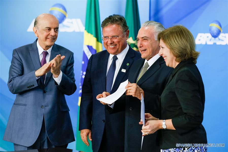 Imagen cedida por Presidencia de Brasil, del presidente interino brasile?o Michel Temer (2-d), los ministros José Serra (i) de Relaciones Exteriores de Brasil y Bairro Maggi (2-i) de Agricultura, Ganadería y Abastecimiento, y la embajadora estadounidense en Brasil, Liliana Ayalde (d), participando durante la ceremonia de anuncio de la apertura de mercado para la carne bovina brasile?a, en Brasilia, Brasil, el 1 de agosto de 2016. Brasil y Estados Unidos de América suscribieron el jueves en Washington un acuerdo que permitirá el ingreso de hasta 64,000 toneladas de carne bovina brasile?a fresca al mayor mercado mundial, anunció el gobierno del país sudamericano. (Xinhua/Marcos Correa/Presidencia de Brasil)