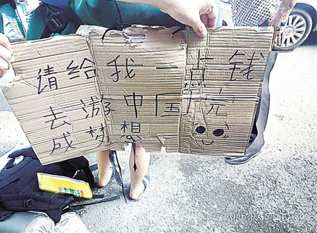 Los tres solamente podían comunicarse en un chino rudimentario. Viajaban con carteles que explican su situación: No tenemos dinero, pero queremos seguir nuestro sue?o de viajar alrededor de China. Podemos tomarnos una fotos juntos y aceptamos una donación"