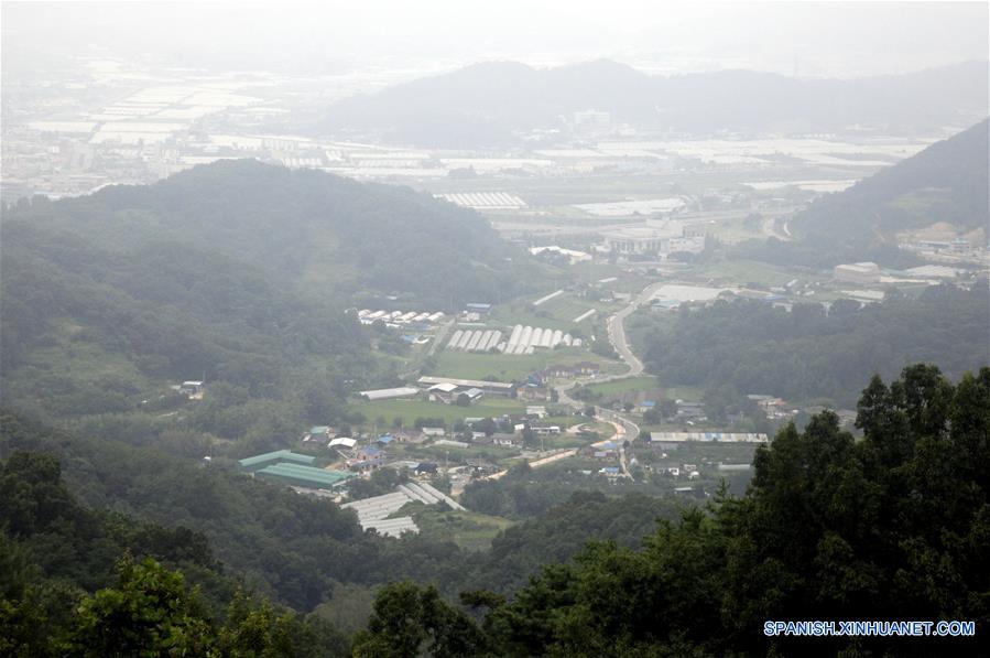 Imagen del 2 de agosto de 2016 de una vista del condado de Seongju, República de Corea. En cualquier rincón del condado de Seongju se puede percibir el profundo enfado de los habitantes de la zona en la que, tras un acuerdo del gobierno con Estados Unidos de América, se desplegará el sistema antimisiles Defensa Terminal de Area a Gran Altitud (THAAD). En casi todas las partes de Seongju, en el que la instalación está prevista para finales de 2017, se pueden encontrar carteles que muestran el rechazo al escudo antimisiles estadounidense. A mucha gente se le puede ver llevando una cinta alrededor de la cabeza que reza "absoluta objeción al THAAD". (Xinhua/Yao Qilin)
