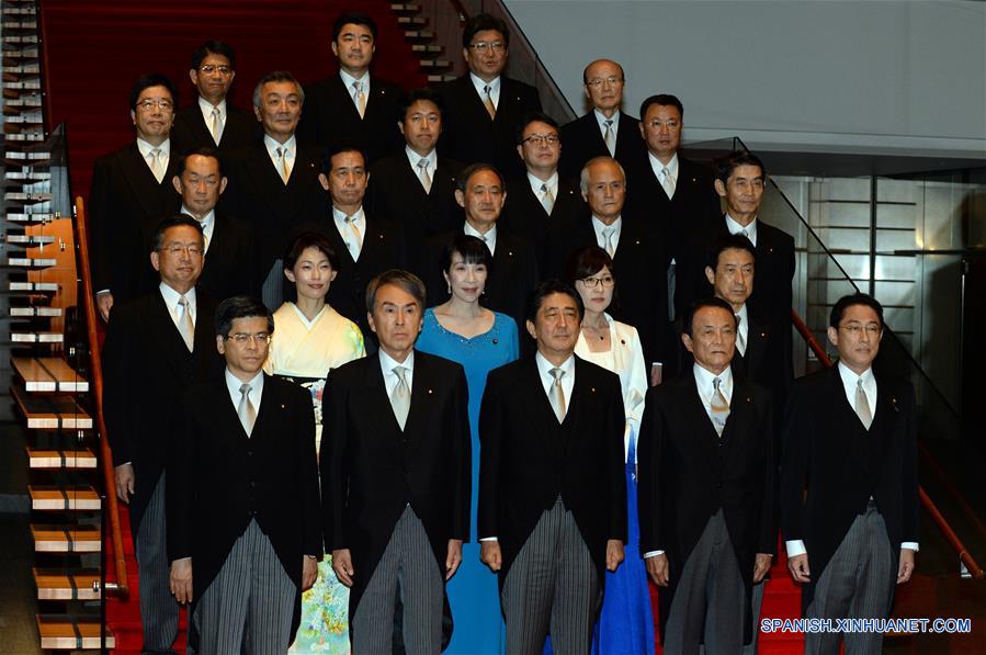 El primer ministro de Japón, Shinzo Abe (c-frente), y los ministros del gabinete posan durante una sesión fotográfica llevada a cabo en la residencia oficial de Abe, en Tokio, capital de Japón, el 3 de agosto de 2016. El primer ministro japonés, Shinzo Abe, remodeló el miércoles su gabinete y decidió mantener a casi la mitad de los ministros en sus cargos, aunque realizó la polémica designación de Tomomi Inada, ex jefe del Consejo de Investigación Política del gobernante Partido Democrático Liberal (LDP), como titular de Defensa en sustitución de Gen Nakatani. (Xinhua/Ma Ping)