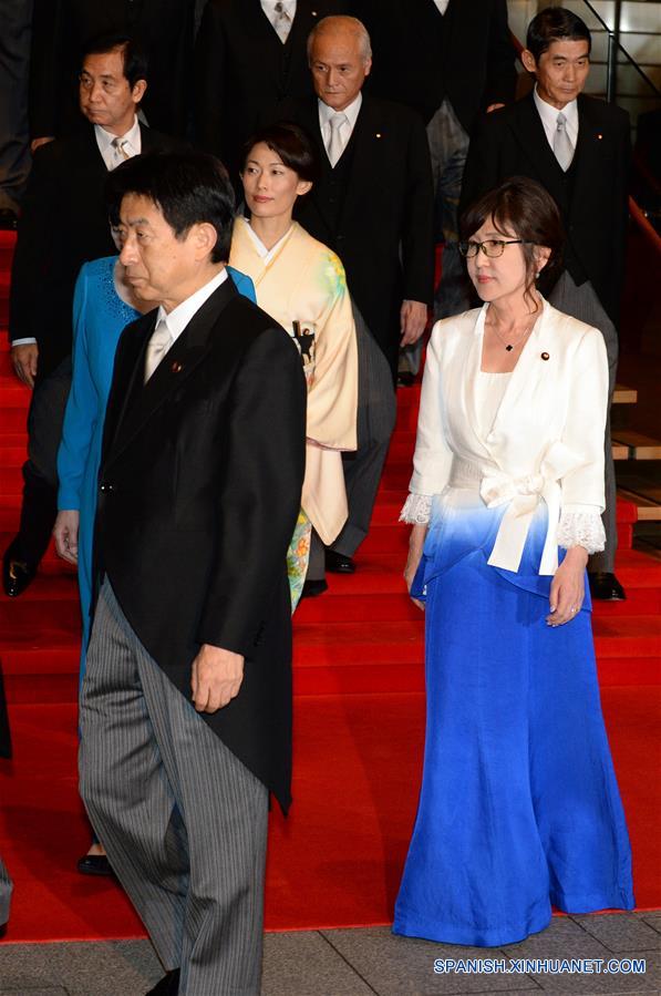 La recién nombrada ministra de Defensa de Japón, Tomomi Inada (d-frente), y otros ministros de gabinete se retiran después de asistir a una sesión fotográfica llevada a cabo en la residencia oficial del primer ministro Shinzo Abe, en Tokio, capital de Japón, el 3 de agosto de 2016. El primer ministro japonés, Shinzo Abe, remodeló el miércoles su gabinete y decidió mantener a casi la mitad de los ministros en sus cargos, aunque realizó la polémica designación de Tomomi Inada, ex jefe del Consejo de Investigación Política del gobernante Partido Democrático Liberal (LDP), como titular de Defensa en sustitución de Gen Nakatani. (Xinhua/Ma Ping)