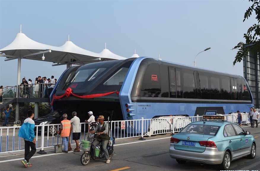 Beijing, 04/08/2016 (El Pueblo en Línea) -Fotos del primer y futurista autobús de tránsito elevado TEB-1 en Qinhuangdao, el 2 de agosto de 2016. Con 22 metros de largo, 7,8 metros de ancho y 4,8 metros de altura el TEB-1 puede transportar hasta 300 pasajeros, según los medios de comunicación.