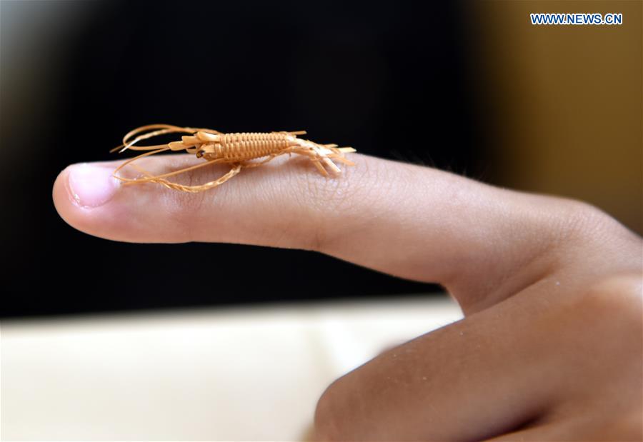 Camarón tejido con bambú hecho por Zhang Yongwang en Tainan, provincia de Taiwán, el 6 de agosto de 2016. (Xinhua/Song Zhenping)