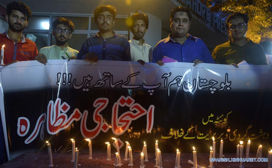 Personas participan durante una vigilia en memoria de las víctimas de la explosión de una bomba en un hospital de Quetta, en Lahore, en el este de Pakistán, el 8 de agosto de 2016. Al menos 70 personas murieron y 112 resultaron heridas en un ataque suicida con explosivos dentro de la zona de emergencias del Hospital Civil de Quetta el lunes. (Xinhua/Sajjad)