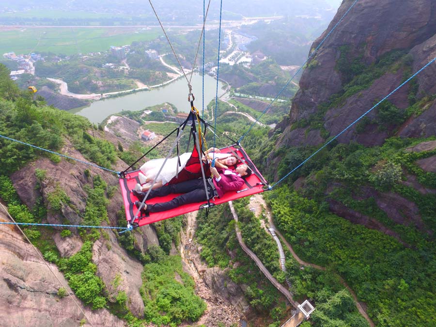 Los recién casados se divierten tumbados en la hamaca colgada del puente de cristal en una zona pintoresca de Pingjiang, provincia de Hunan, durante la celebración de su boda en le día de San Valentín chino el martes 9 de agosto de 2016. [Foto/Chinanews.com]