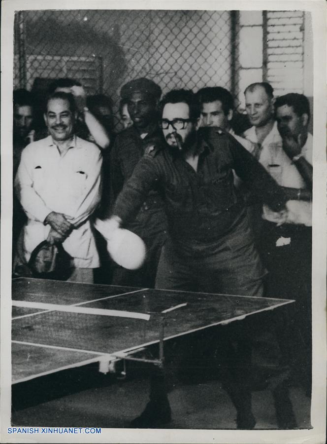 LA HABANA, agosto 11, 2016 (Xinhua) -- Imagen del 5 de mayo de 1962, de Fidel Castro (d), jugando tenis de mesa durante la inauguración de una guardería para ni?os en La Habana, Cuba. El líder de la Revolución Cubana, Fidel Castro, es una de las figuras políticas que más pasiones despierta en el mundo. El cumplea?os número 90 de Castro, el próximo 13 de agosto, vuelve a acaparar la atención mundial hacia Cuba, un país que en la actualidad vive cambios políticos de gran trascendencia para el curso del Caribe y el mundo. Fidel Castro nació el 13 de agosto de 1926 en Birán, en la antigua provincia de Oriente, hoy Holguín, situada en el noreste de Cuba, hijo del inmigrante gallego Angel Castro y la campesina cubana Lina Ruz. En 2006, tras someterse a una cirugía por una hemorragia intestinal, entregó de manera temporal la presidencia a su hermano Raúl, segunda figura política de la Revolución, y el 19 de febrero de 2008 declinó su reelección. En la actualidad está retirado de todos sus cargos en el Estado, dedicando su tiempo a investigaciones científicas y en algunas ocasiones recibe en su casa a personalidades extranjeras. (Xinhua/Keystone Press Agency/ZUMAPRESS)