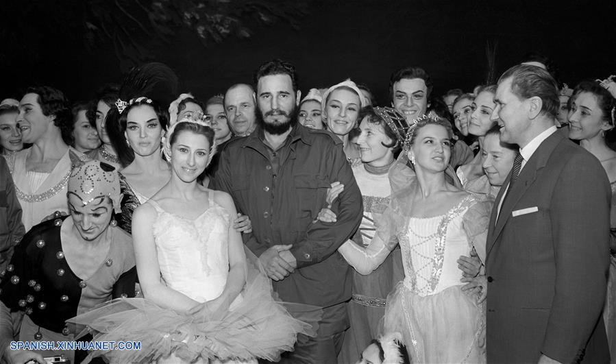 LA HABANA, agosto 12, 2016 (Xinhua) -- Imagen sin fechar, de Fidel Castro (c), posando con Maya Plisetskaya (2-i-frente), prima ballerina assoluta del Bolshoi, en Moscú, Rusia. El líder de la Revolución Cubana, Fidel Castro, es una de las figuras políticas que más pasiones despierta en el mundo. El cumplea?os número 90 de Castro, el próximo 13 de agosto, vuelve a acaparar la atención mundial hacia Cuba, un país que en la actualidad vive cambios políticos de gran trascendencia para el curso del Caribe y el mundo. Fidel Castro nació el 13 de agosto de 1926 en Birán, en la antigua provincia de Oriente, hoy Holguín, situada en el noreste de Cuba, hijo del inmigrante gallego Angel Castro y la campesina cubana Lina Ruz. En 2006, tras someterse a una cirugía por una hemorragia intestinal, entregó de manera temporal la presidencia a su hermano Raúl, segunda figura política de la Revolución, y el 19 de febrero de 2008 declinó su reelección. En la actualidad está retirado de todos sus cargos en el Estado, dedicando su tiempo a investigaciones científicas y en algunas ocasiones recibe en su casa a personalidades extranjeras. (Xinhua/TASS/ZUMAPRESS)