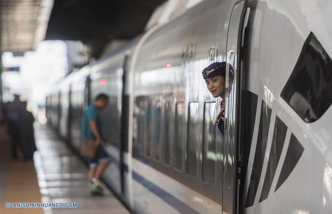 XINJIANG, agosto 12, 2016 (Xinhua) -- La asistente de un tren espera por los pasajeros a bordo de un tren bala en una nueva estación para trenes de alta velocidad en Urumqi, capital de la Región Autónoma Uygur de Xinjiang, en el noroeste de China, el 12 de agosto de 2016. La estación que es la intersección ferroviaria con la escala más grande y con las más avanzadas instalaciones, fue puesta en operación el viernes. (Xinhua/Jiang Wenyao)