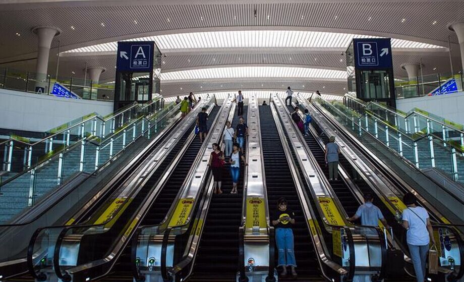 XINJIANG, agosto 12, 2016 (Xinhua) -- Pasajeros toman las escaleras eléctricas en la sala de espera de una nueva estación para trenes de alta velocidad en Urumqi, capital de la Región Autónoma Uygur de Xinjiang, en el noroeste de China, el 12 de agosto de 2016. La estación que es la intersección ferroviaria con la escala más grande y con las más avanzadas instalaciones, fue puesta en operación el viernes. (Xinhua/Jiang Wenyao)