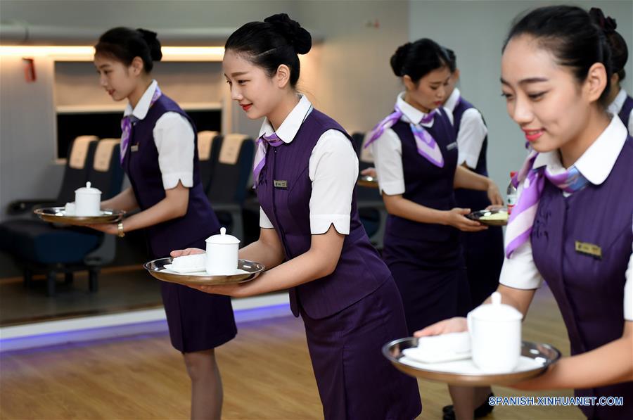 Azafatas participan en un curso de formación en Hangzhou, capital de la provincia de Zhejiang, en el este de China, el 17 de agosto de 2016. Más de 2,000 miembros de la tripulación de trenes de alta velocidad han recibido entrenamiento con el fin de ofrecer un mejor servicio a los viajeros en Hangzhou, ciudad anfitriona de la próxima Cumbre del G20. (Xinhua/Huang Zongzhi)