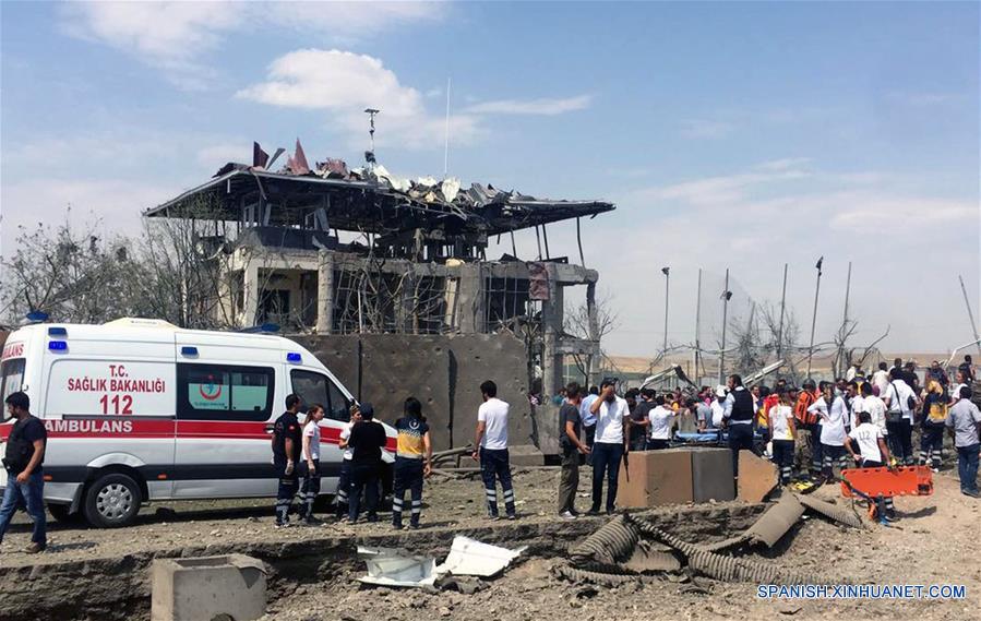Una ambulancia llega al lugar de la explosión cerca de una estación de policía de tráfico en el sureste de la provincia de Diyarbakir, 15 de agosto de 2016. (Xinhua / Mert Macit)