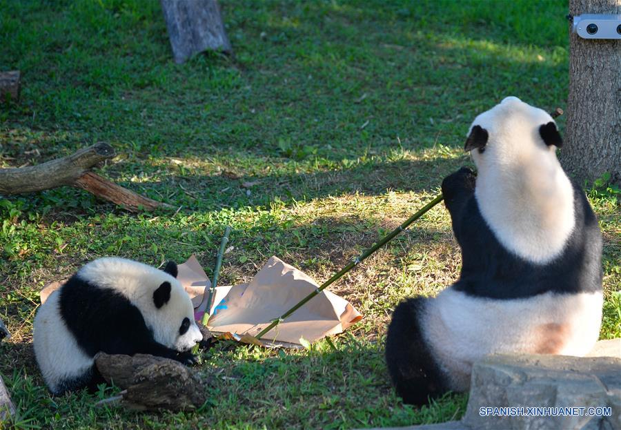 El panda gigante Beibei (i), juega con su madre Meixiang (d), en el Parque Zoológico Nacional, en Washington D.C., Estados Unidos de América, el 20 de agosto de 2016. Para celebrar que Beibei ha cumplido un a?o de edad, una serie actividades de celebración fue llevada a cabo en el parque. (Xinhua/Bao Dandan)