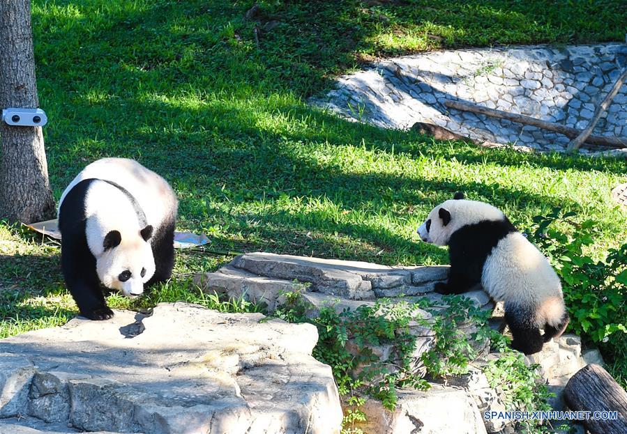 El panda gigante Beibei (d), juega con su madre Meixiang (i), en el Parque Zoológico Nacional, en Washington D.C., Estados Unidos de América, el 20 de agosto de 2016. Para celebrar que Beibei ha cumplido un a?o de edad, una serie actividades de celebración fue llevada a cabo en el parque. (Xinhua/Bao Dandan)
